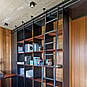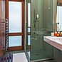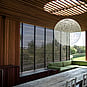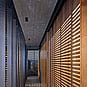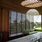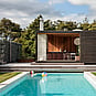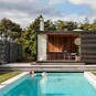 The garage building is sandwiched between a concrete floor and roof slab, enhancing the lightness of the timber. The bright and breezy feeling inside the sauna-style pool pavilion is pleasantly counterintuitive. Views are framed and pixelated by timber screens, providing a contrast to the expansive outlook from the existing house. It’s a complex build that has been executed with precision.