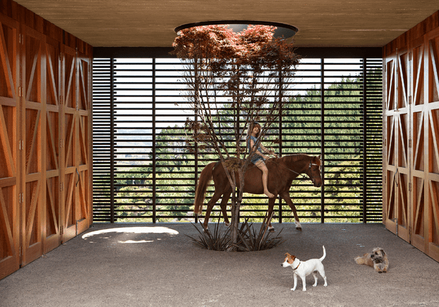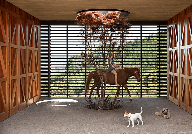 The pavilions serve separate purposes: one houses a recreation room, swimming pool, pool pavilion and tennis court; the other is utilitarian, with a garage, storerooms and office. The form and fabric of the buildings contrast beautifully with each other.