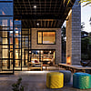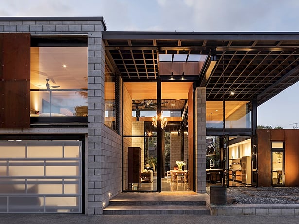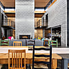 Entrance through the grand double-height steel-framed doors into the cavernous open-plan kitchen/dining/living space is dramatic. This effect is amped up by a full-drop velvet curtain which aids acoustics as do the cedar battened ceilings. Kauri ply linings and recycled wooden doors from the former state house on the site lend warmth and character.