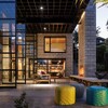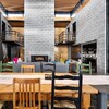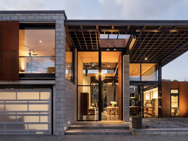 Entrance through the grand double-height steel-framed doors into the cavernous open-plan kitchen/dining/living space is dramatic. This effect is amped up by a full-drop velvet curtain which aids acoustics as do the cedar battened ceilings. Kauri ply linings and recycled wooden doors from the former state house on the site lend warmth and character.