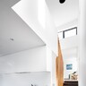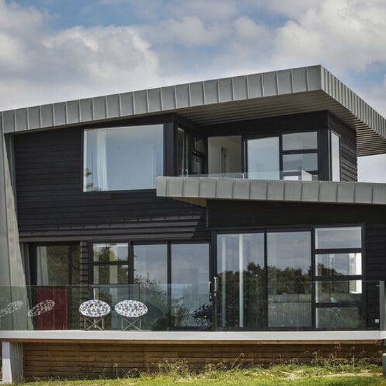 Each structure had its own challenges. The front section features two tilted L-shaped forms designed to frame the view and create privacy from the street. These were clad in dark-stained weatherboards and topped with overhanging zinc roofs. Large glazed openings were carefully installed beneath these eaves to maintain structural integrity while keeping the lines clean. At the rear, we built a simple cube form clad in white painted brick. Recessed windows were set into the solid facade, and a fully glazed link forms the back entrance and ties both buildings together.